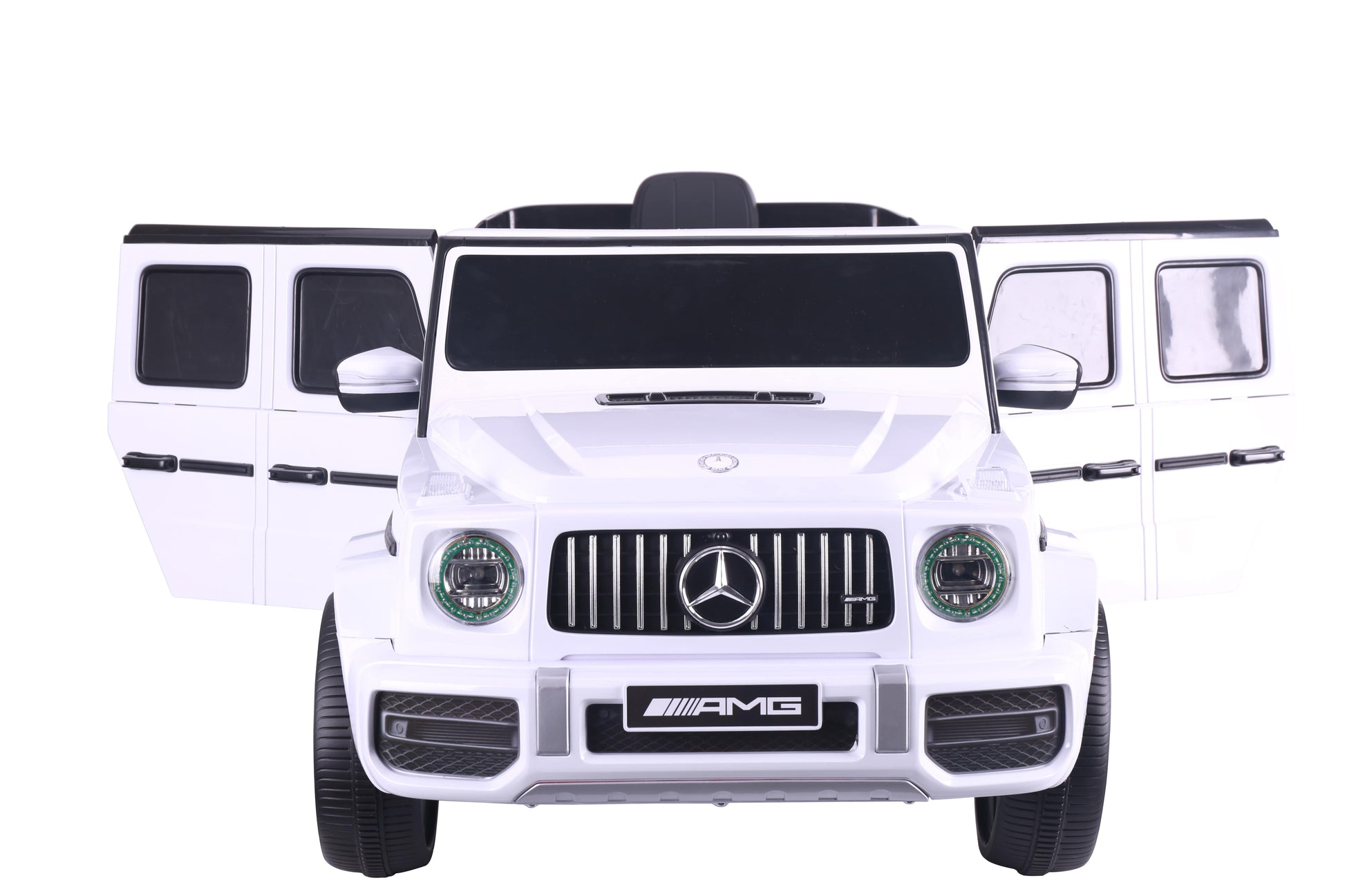 Introducing the Mercedes G63 Kids Ride-On Car in a sleek White finish with high doors! This stunning electric car is designed to provide young adventurers with an exciting and realistic driving experience.